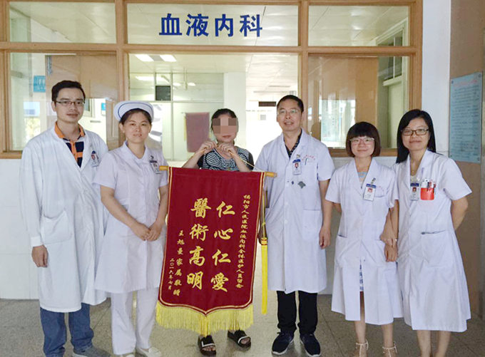 王女士向血液内科医务人员赠送锦旗。许晓东 邹仰光 摄
