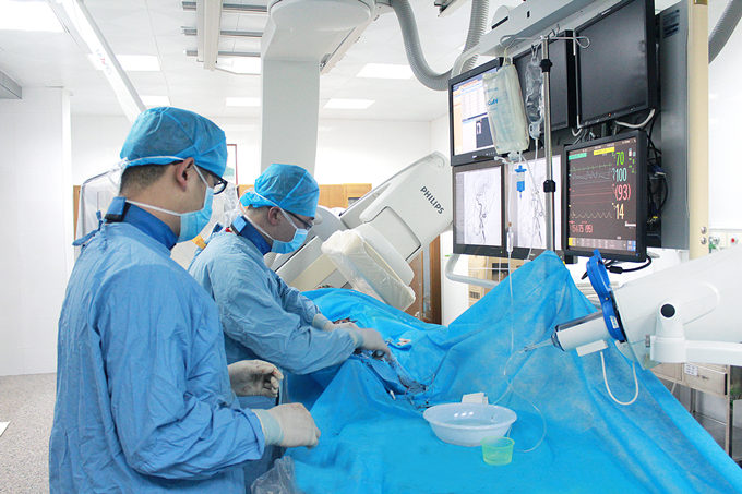 罗世炜为患者实施脑血管介入取栓术,打通闭塞脑血管通路。邹仰光 摄