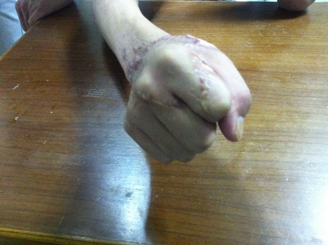 术后10多天,小林右手掌长出了新的肉芽,洪医师又为其进行了取皮植皮手术。在医护人员的指导下,小林努力地进行手部功能锻炼。一个多月后,小林的右手竟能握拳了。“很不错,基本恢复了9成以上的手部功能。”洪医师对康复效果非常满意。