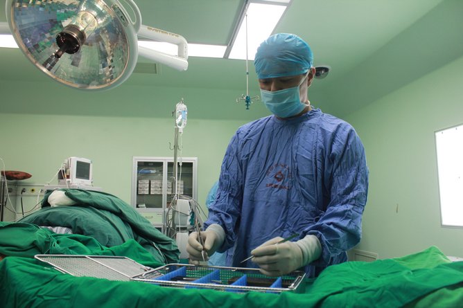 医生从显微包取出显微镊准备手术。
